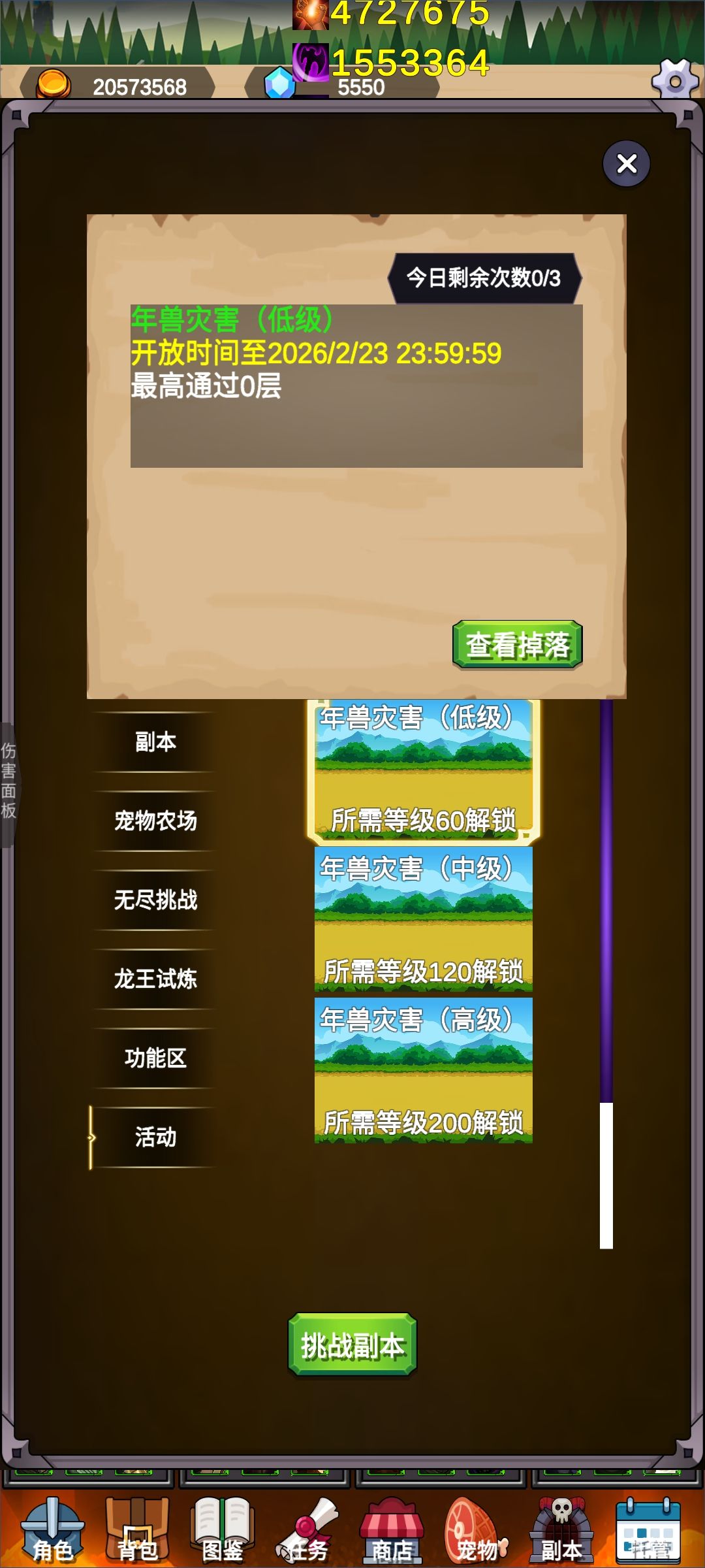 副本分为3个等级,能给对应等级和实力的玩家选择挑战,每天限制次数,挑战完还能用掉落物去商店里进行兑换。难度会非常的高,但是经过多次测试,只要合理的搭配,都能非常轻松的打过。而且商店里还有鞭炮,每丢一个鞭炮可以炸非常多的血量,不过鞭炮数量有限,所以看自己情况去决定需不需要用鞭炮