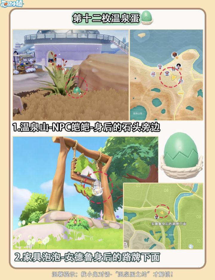 1. 第12枚温泉蛋:温泉山NPC皑皑身后的石头旁(图5左上)。