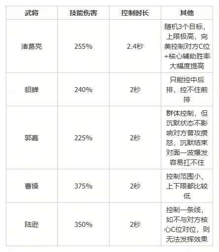 相较于其他常用控制武将的技能,八门金锁的整体输出能力是很不错的,尤其是控制时长,大幅度领先,这里简单列表给大家进行对比一下: