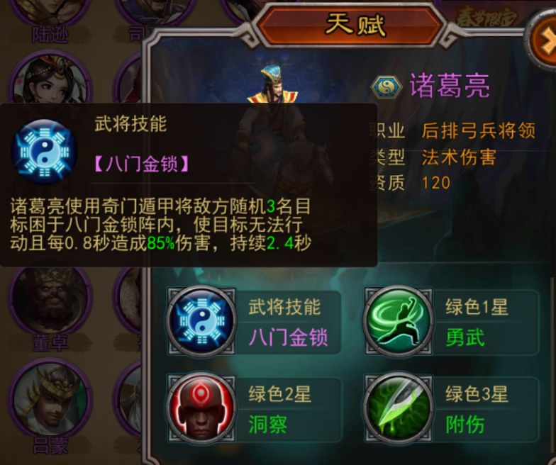 八门金锁:诸葛亮使用奇门遁甲将敌方随机3名目标困于八门金锁阵内,使目标无法行动且每0.8秒造成85%伤害,持续2.4秒。