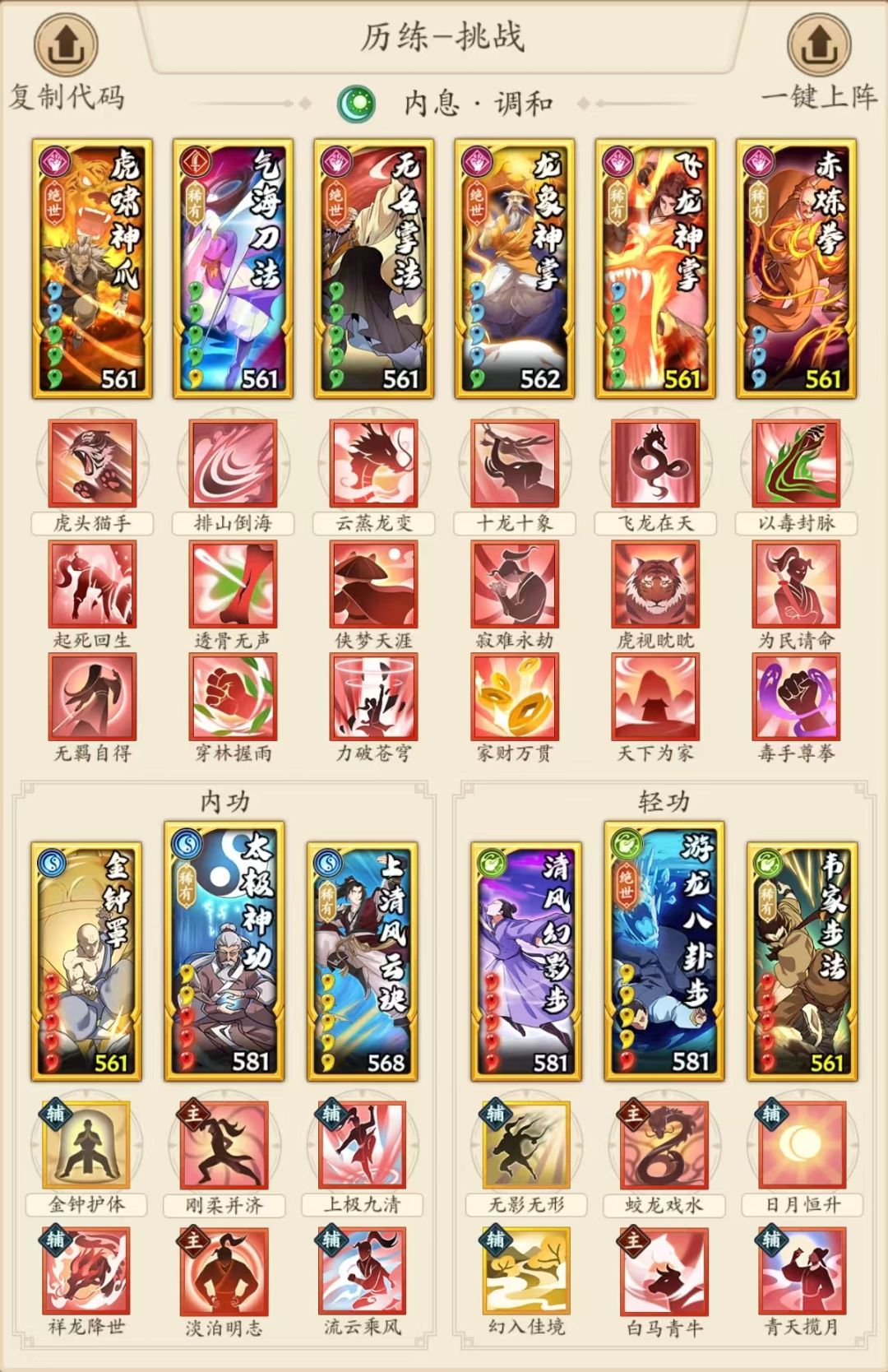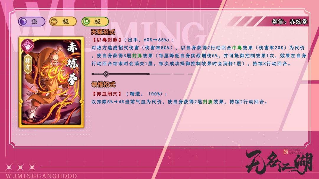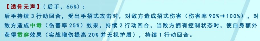 这武学也不知道策划咋想的,名字敷衍也就罢了,原效果更是逆天(自己吃dot,降增伤,出手),槽点都叠满了,好在设计更新,解控后增加15%增伤,游龙拳总算也是能上阵,可以放在1号或2号吃气海,或者5号吃后手控,或是6号保1号位,但是后手拳依旧不建议。