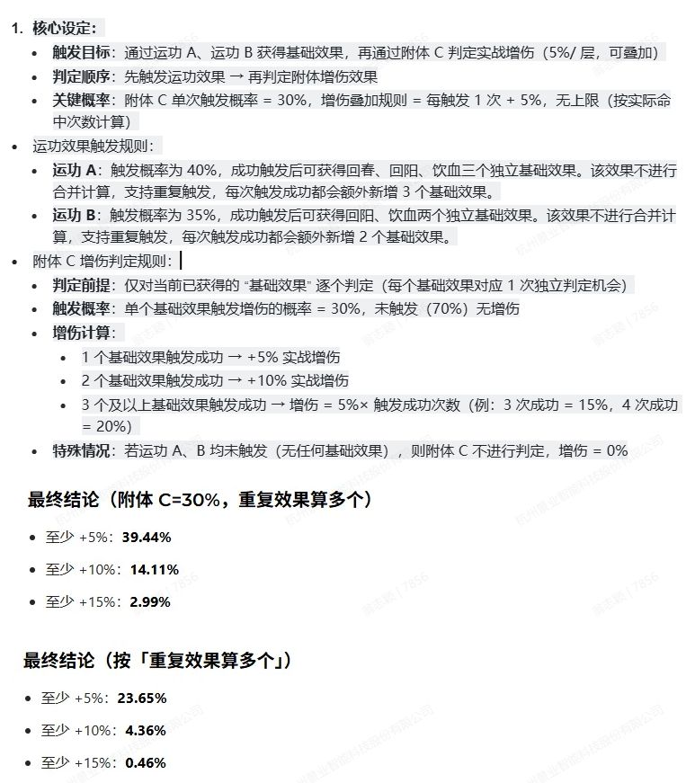 关于效果触发的计算如下图所示,A代表灵心决,B代表祥龙招式,C代表灵瞳附体招式,最终结果是灵瞳主运(30%概率)和辅运(15%概率)在搭配祥龙和灵心决情况下的触发概率,其中至少5%也表示解夺命的概率。
