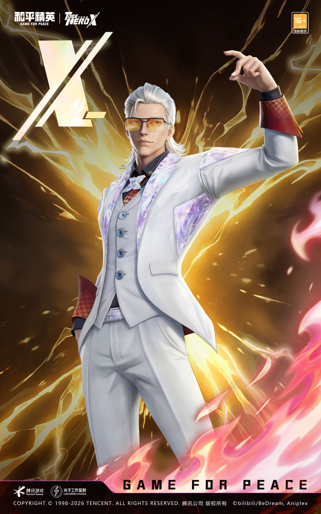 以全息棱镜光泽西装为核心设计元素,X联名皮肤打造出白衣绅士的优雅形象,整体质感细腻出众。西装所带的全息棱镜光泽极具辨识度,在不同光线照射下呈现出多样视觉效果,精准贴合X“孤独天才”的角色设定。