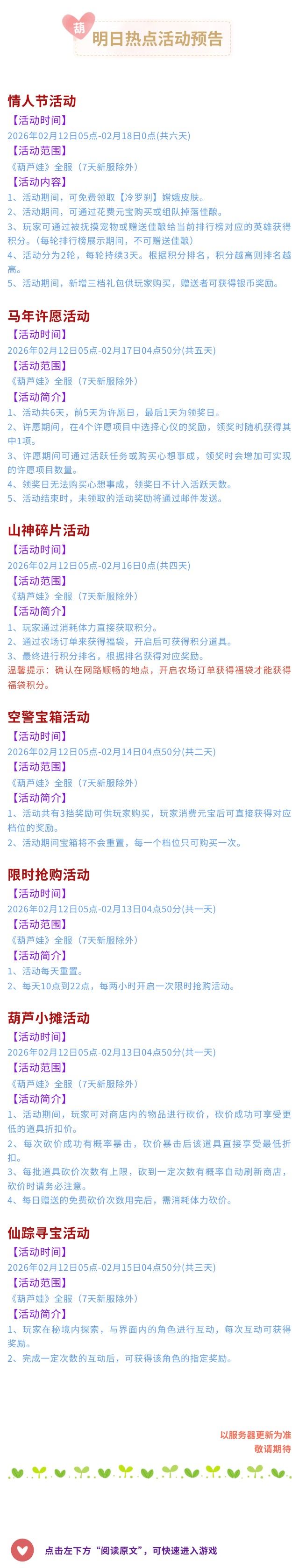 【葫芦娃】2月12日活动预告