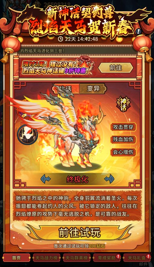 1、全新神话契约兽——“烈焰天马”登场,登录就送六代天马