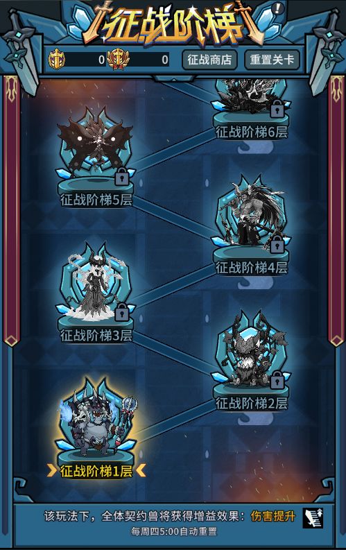 4、挑战超过一个关卡即可重置关卡,重置关卡会把关卡进度清零,并恢复契约兽的出战次数,但是奖励不会重置5、每周四5:00会重置征战阶梯的奖励