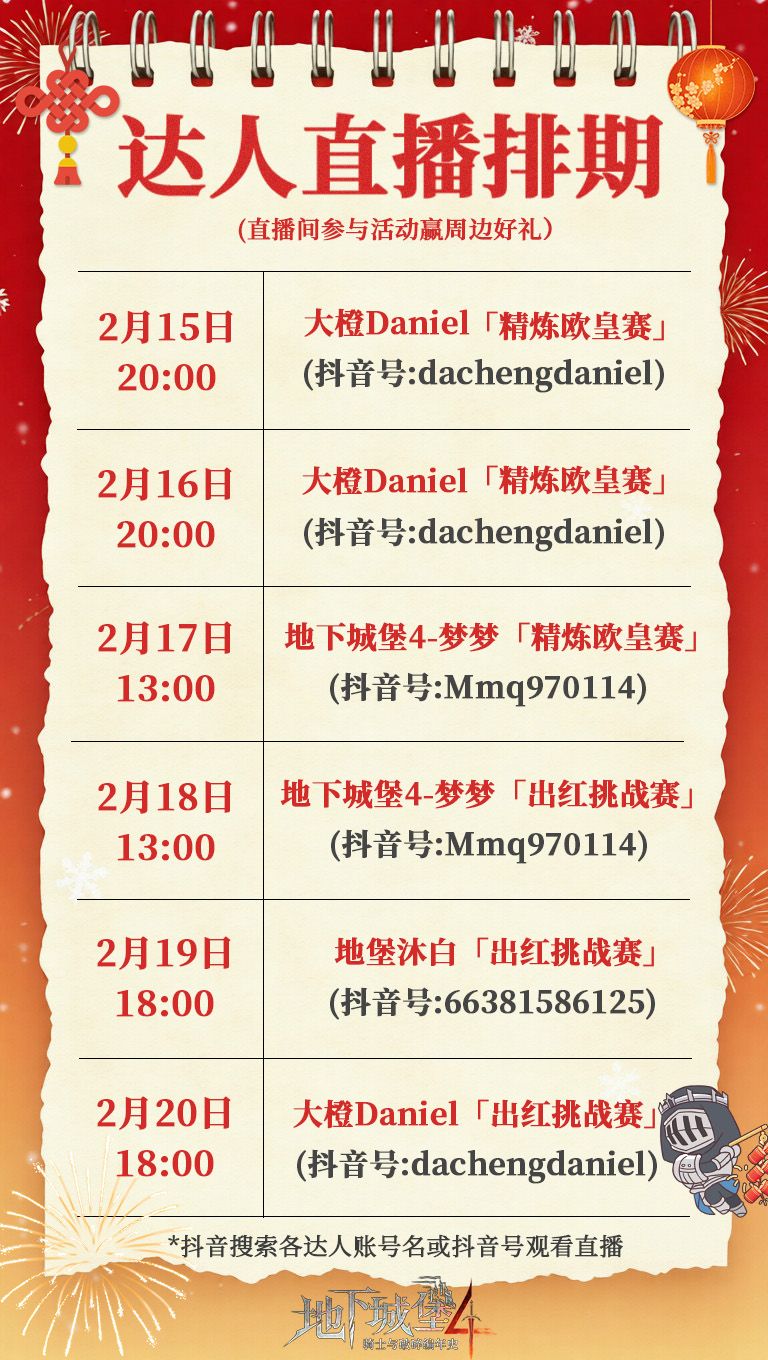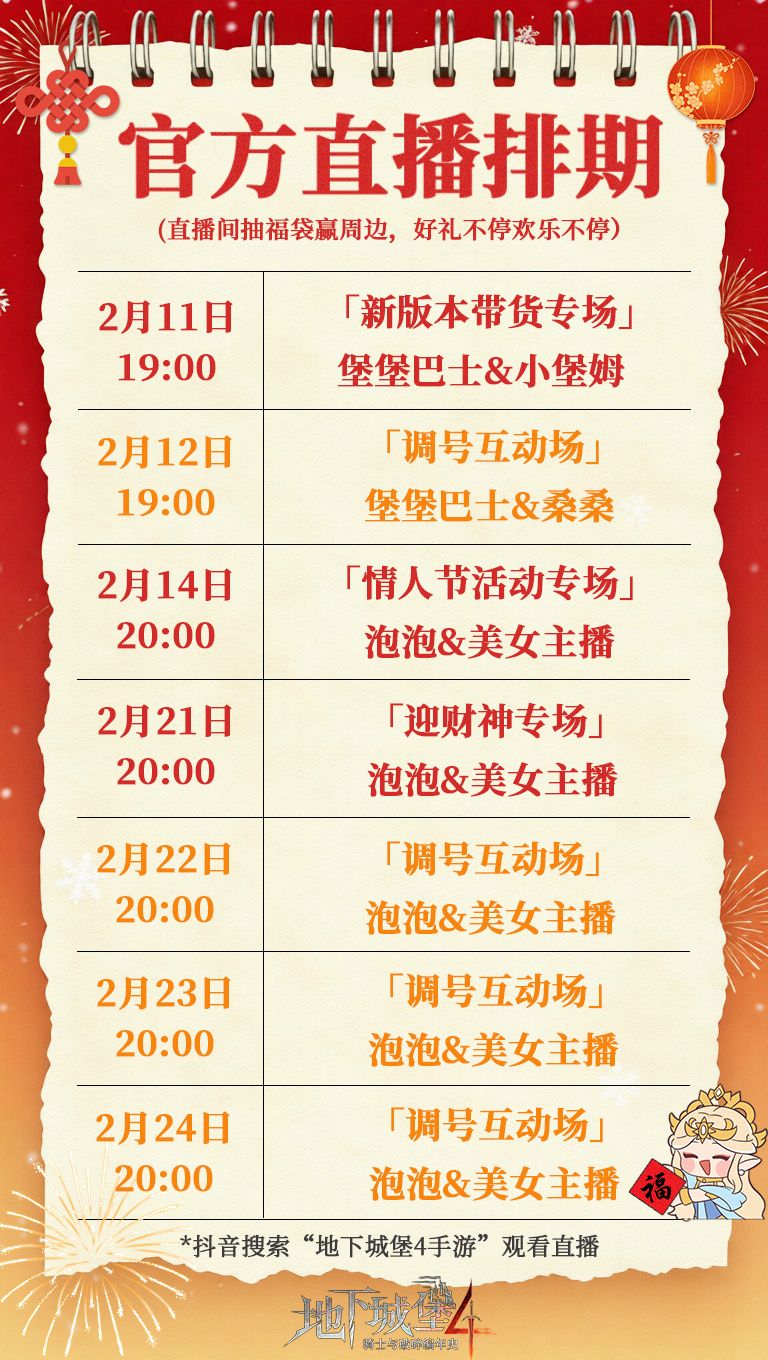 堡主们好!春节期间的直播排期来啦!情人节至大年初八,官方与多位人气达人轮流接档、天天开播,陪你度过整个春节假期!提前关注官方和达人账号,福利不停、欢乐不断,我们直播间不见不散——