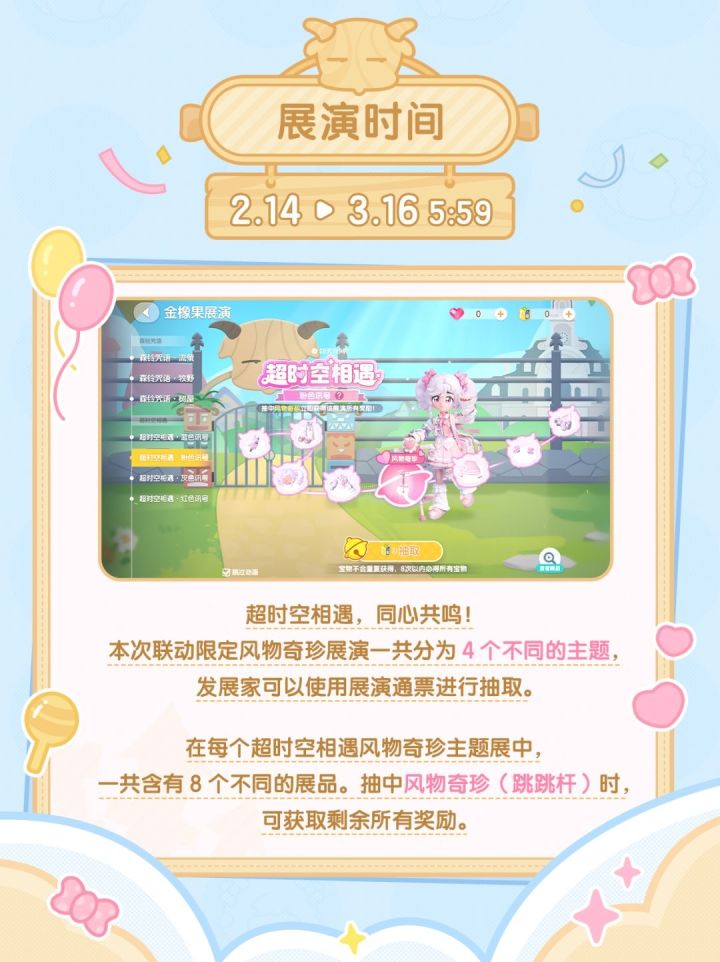 《心动小镇》与《喜羊羊与灰太狼》的超时空联动将于2月14日启动,玩家可通过组队收集能量解锁「灰太狼披风」「喜羊羊滑板」等限定道具,并获取专属羊村身份标识。活动同步推出「风物奇珍主题展」与「超时空营救大作战」玩法,联动期间登录可领限时展演通票,累计抽取「寒风」「冷刃」特效时装及赛博风格「自由」「率真」套装。金橡果商会新增三款主题载具「蛋蛋车」,完成进度奖励可兑换双人乘坐坐骑并播放羊村BGM。