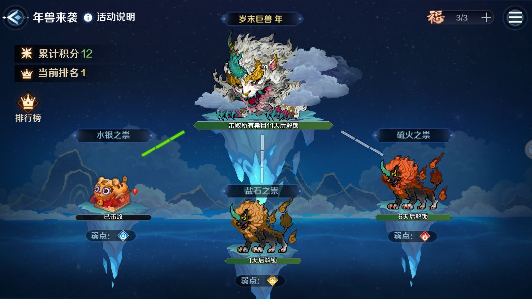 ①年兽来袭活动期间,消耗活动道具“福”挑战年兽,根据玩家战斗造成的伤害计算活动积分。全服玩家对敌人造成的伤害累计到一定数值后,敌人被击败,玩家获得击败奖励。每次战斗后根据玩家本次战斗获取的积分来发放该次战斗的奖励。
