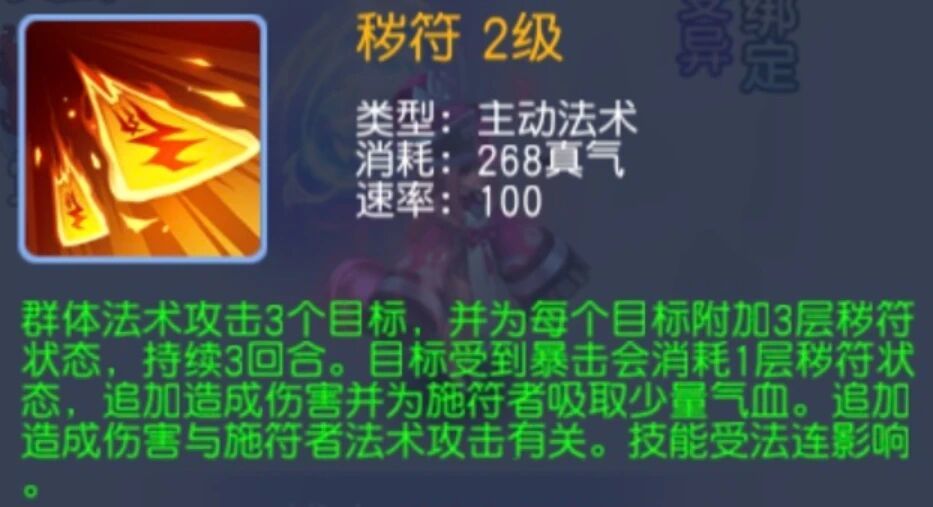 秽符不仅能造成群体法术伤害,还能附加秽符状态,目标受暴击时会追加伤害,并为施法者吸取少量气血。