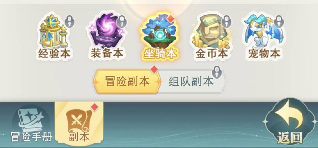 游戏内冒险副本分为五大类,每类副本的解锁会根据角色的等级逐步开放。
