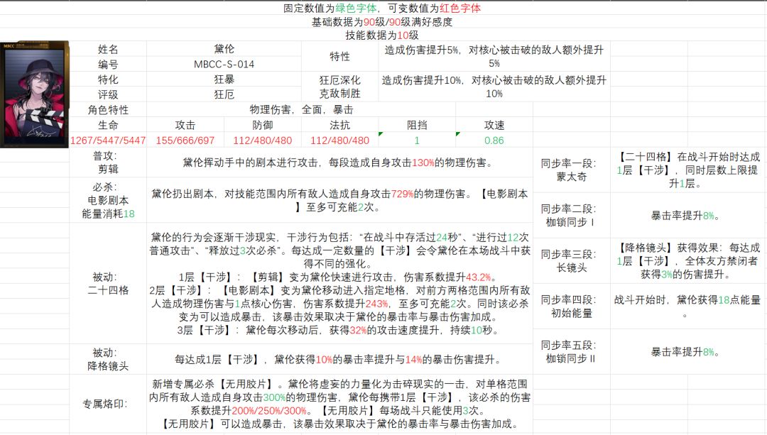 6、影像侵入·重构暴击转暴伤,叠满要200%暴击率,现在正常情况下黛伦只有5(干涉层数)*10%(被动2)+16%*2(25锁),+10%(耶莱娜)+22%(高塔审判)=114暴击率,即便多携带玉骨也就146.5%暴击率,叠不满。而黛伦本身是低段数高单段伤害的角色,一段不暴击伤害亏巨多,所以尽可能满锁有超过百爆伤害才稳定,这也是我说尽可能高锁的原因
