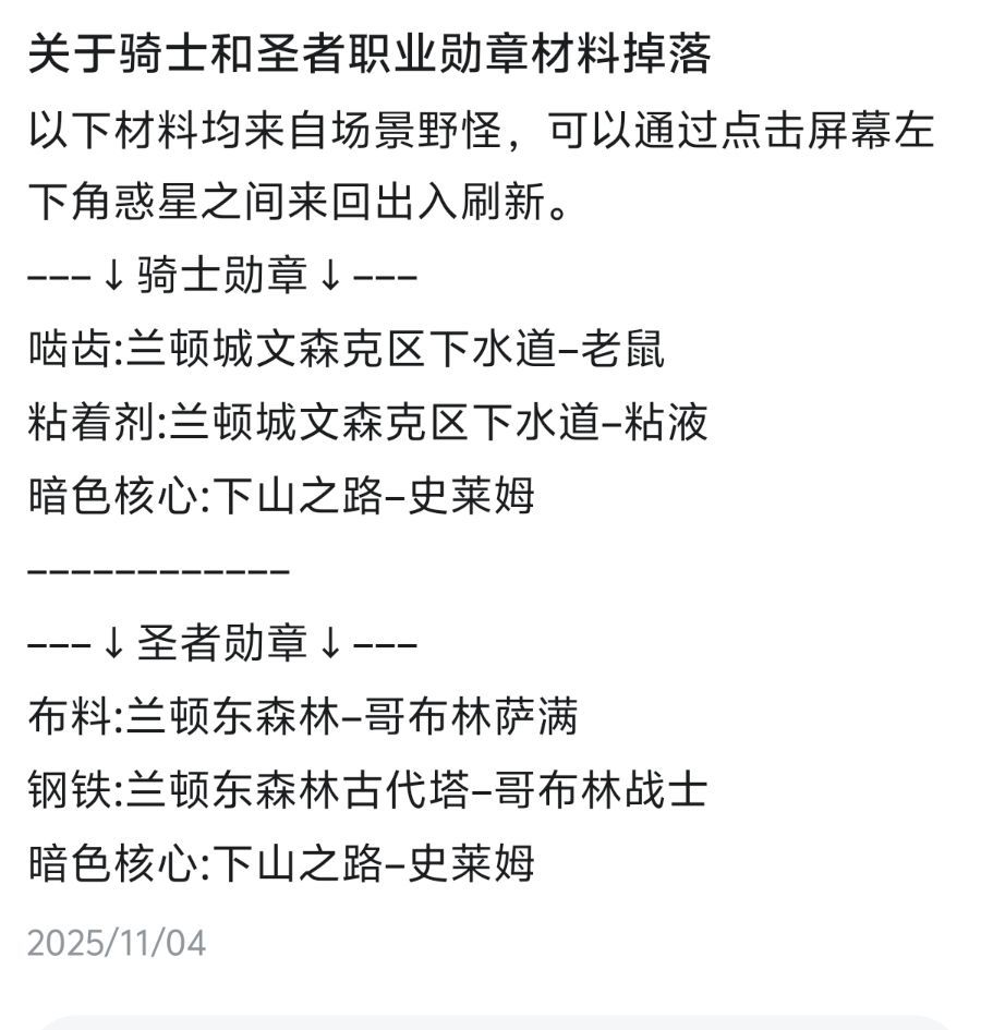 引用于论坛中@Ruby_Scarlett大佬发布的帖子@关于骑士和圣者职业勋章材料掉落https://www.taptap.cn/moment/734769461877278712