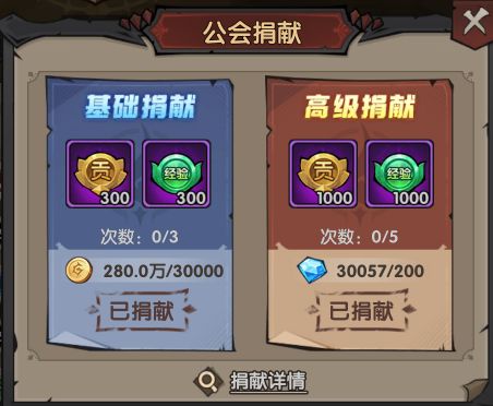 公会的成长离不开全成员的努力,每天勇者都有3次金币捐献与5次钻石捐献的次数,捐献成功后可获得贡献值和经验,贡献值可在公会商店中兑换各种稀有材料。