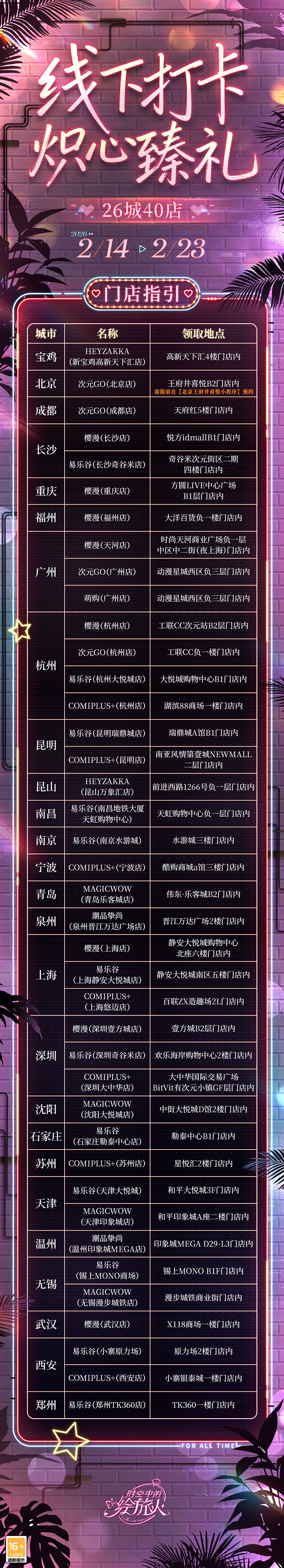 💘活动城市:宝鸡、北京、成都、长沙、重庆、福州、广州、杭州、昆明、昆山、南昌、南京、宁波、青岛、泉州、上海、深圳、沈阳、石家庄、苏州、天津、温州、无锡、武汉、西安、郑州