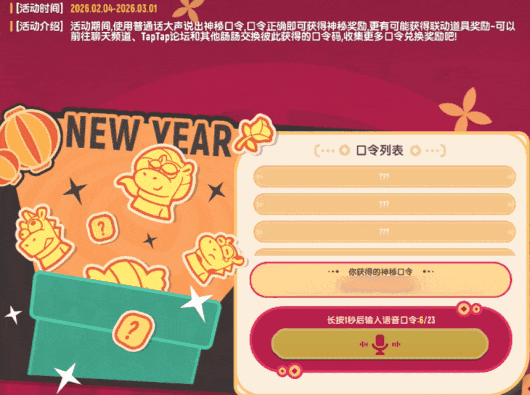 大家好,我是蛋卷!岁律更新,马年将至,肠岛张灯结彩,弥漫着浓浓的贺岁氛围~【春节庆典】口令兑大奖活动即将开始,来和蛋卷一起看看本次活动的详细内容吧!