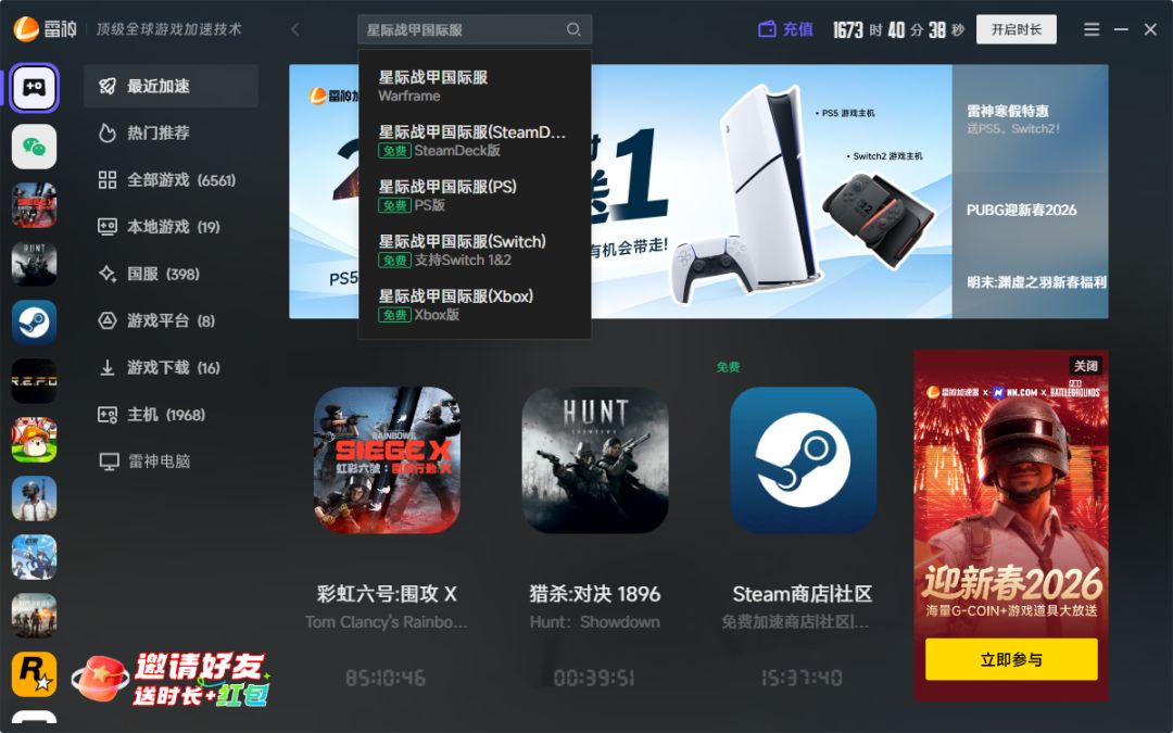 1. 打开雷神加速器搜索“星际战甲国际服”。