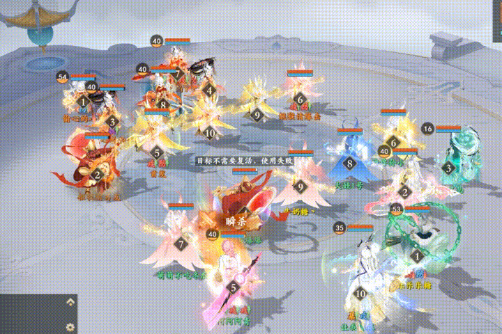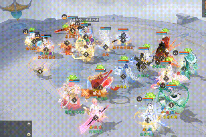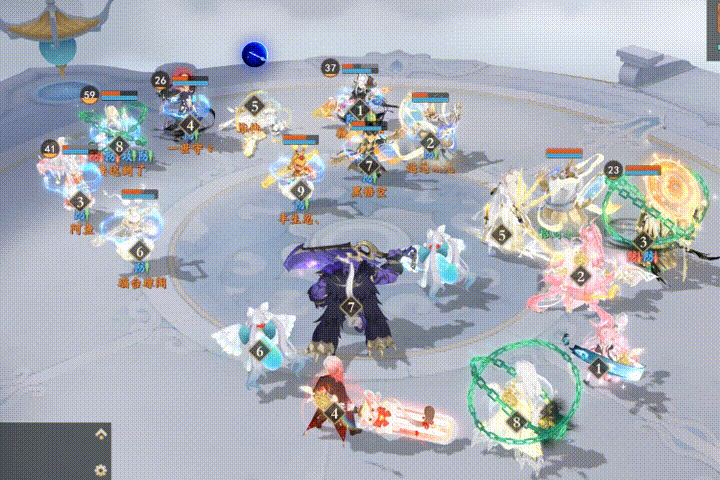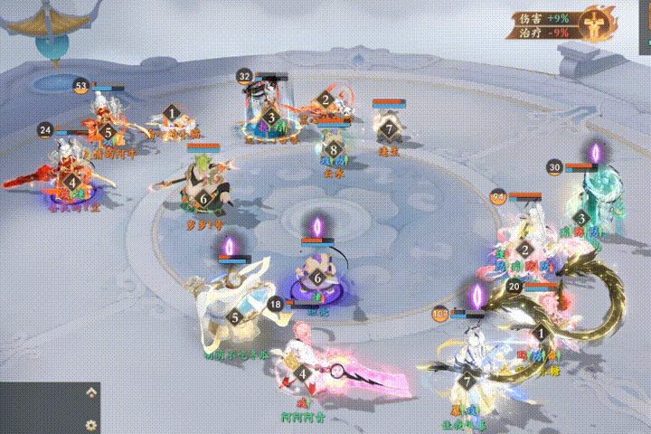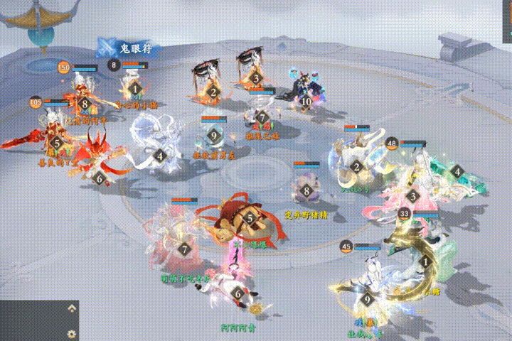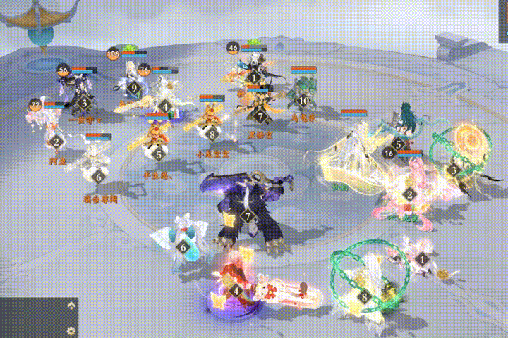 第5-6回合对战方奶妈被持续封印导致回复不足,观战方输出单位肆意输出,一直到回合结束对战方仅有阴阳以及被封印的医仙活着,宝宝也仅剩下两只猴子一只魔礼海。