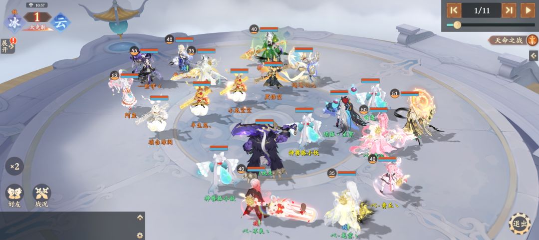 第1回合,对战方仍选择了清宠,战魂狂击配合天师与宠物清理掉了观战方两只猴子,而观战方将双面伤的阵容优势发挥到了极致,双输出一轮出手对战方3个人物单位只剩1丝血。