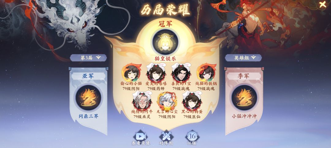 偷心的小猫:首先,要感谢我的小宝——榴莲,以及阁主、明总的帮助,还要感谢团队成员帅y、大猫、小牛、心尘、嘻嘻、老黑还有编外成员瓜哥、温柔的支持。对于这次夺冠应该说并不意外,毕竟我们征战了三届,从第一届八强折戟渣哥(该死的无限庇护魔礼海),到第二届半决赛惜败资哥,再到本届决赛鏖战三局,每一步都踏着汗水与默契。我相信“冠军不是终点,是猫皇新纪元的起点”。
