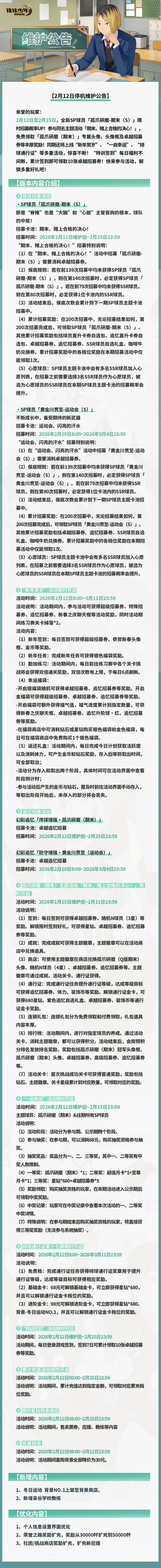 4. 孤爪研磨(期末)主题活动「期末、赌上合格的决心!」限时开启,活动期间内,参与活动可获得孤爪研磨(Q版期末)头像、随机N球员(4星)、卓越招募券、追忆招募券等奖励。