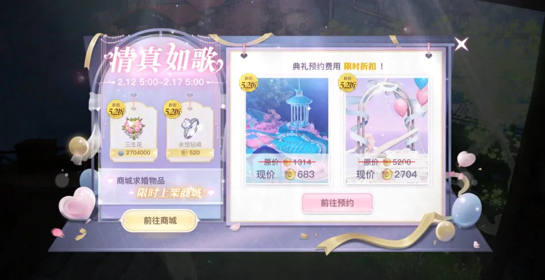 2.活动说明:活动期间,赠送好友任意好感度道具,均可额外获得10%的好感度(额外好感度上限为每日2514点)。且一次性发送12个1314价值道具,还会播送一次跨服广播,让全云垂听见你的爱!此外,结契限时免费,商城求婚道具与婚礼套餐限时5.2折,快邀请结契对象到三生树下喜结连理,在这个浪漫的日子大胆示爱吧!