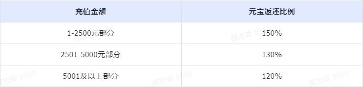 注:所有RMB充值的付费都算入充值金额,直购礼包也包括在内。但仅计算金额返还对应比例元宝,游戏内赠送的任何元宝和其他道具奖励都不计入返还内容。