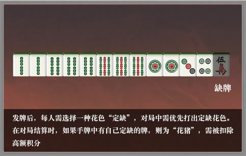 对局结束前,玩家必须打完自己手牌中所有“定缺”花色的牌。如果胡牌时手牌中还有定缺花色的牌,不仅无法胡牌,还会被“查花猪”,结算时要受到重罚。