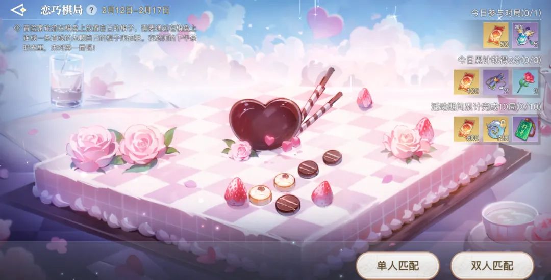 2.活动说明:恋巧棋局限时开启,恋巧棋局支持单人或双人匹配,匹配成功后,冒险家轮流在棋盘上放置自己的棋子,需要通过在棋盘上连成一条直线的五颗自己的棋子来获胜。完成对局任务后可以获得限定称号等丰厚奖励。