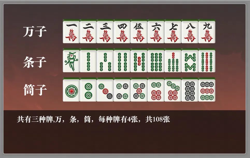 牌型: 包含万、筒、条三种花色,每种花色从1到9各4张。