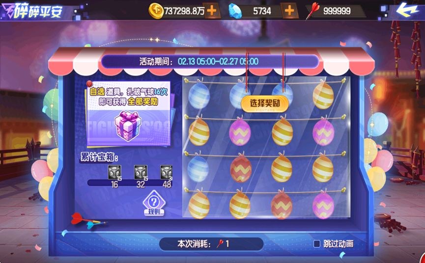 在碎碎平安活动中中可以用其他活动中得到的飞镖道具扎气球,能获得各种想要的道具,扎的越多,奖励越丰厚~