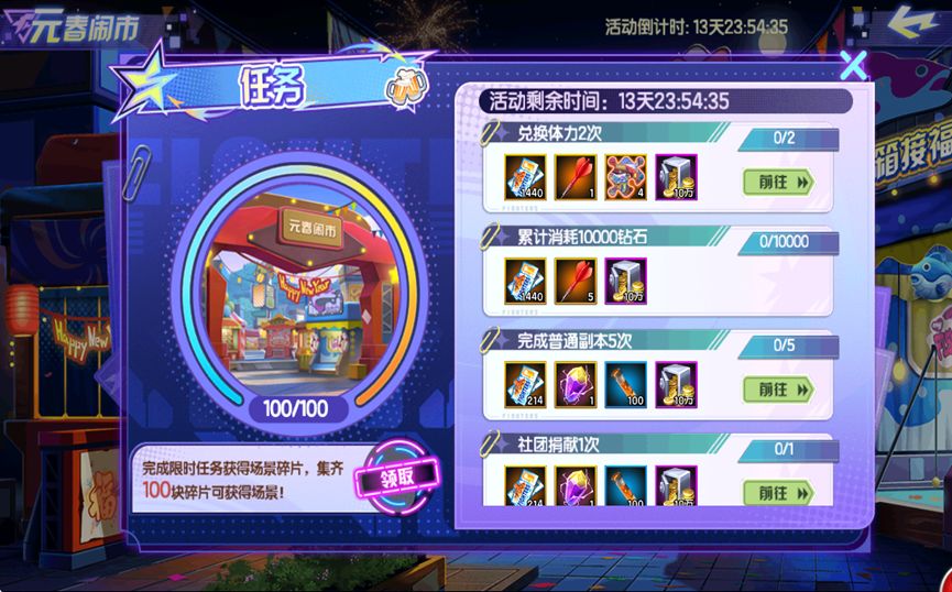 元春可以查看所有的限时任务,完成任务获得场景碎片和其他丰厚奖励,集齐碎片可获得昼夜交替的春节专属场景