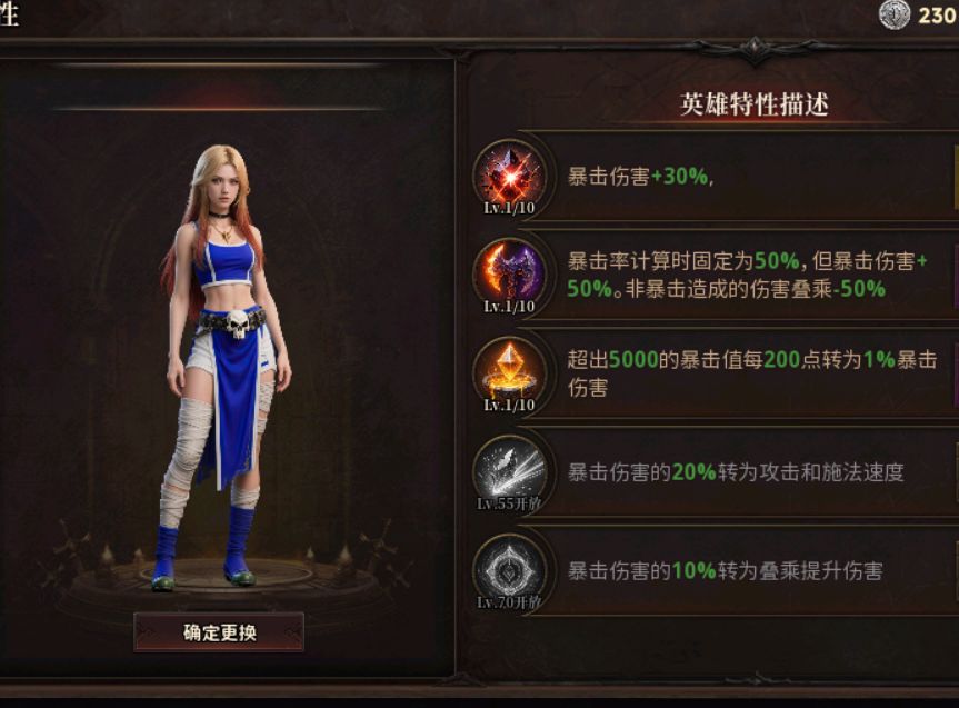目前最适合开荒的角色为艾薇,特性二暴击率固定50%,配合双运暴戮(系统送)辅助技能达到75%常驻暴击,前期不用堆暴击。并且由于暴击率固定,我们还可以在装备上选择减少暴击值增加暴击伤害的特效