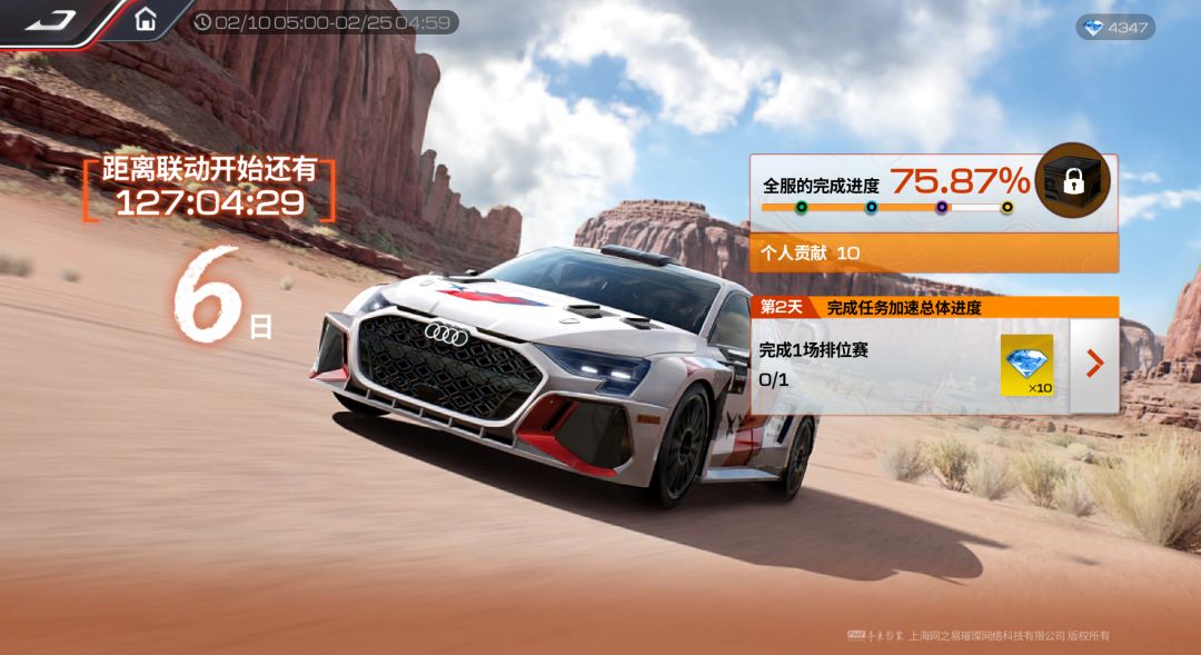 现在上线完成任务加速总体进度,就能和小可一起解锁满满好运和飞驰惊喜,助力各位车手赴一场热血飞驰之约,共启新春欢喜~