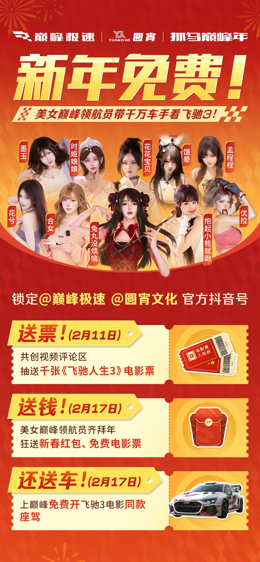 各位车手注意啦!锁定@巅峰极速和@圆宵文化官方抖音账号,评论区直接狂抽千张《飞驰人生3》电影票,主打一个免费观影!参与步骤超简单,小可手把手教你👇