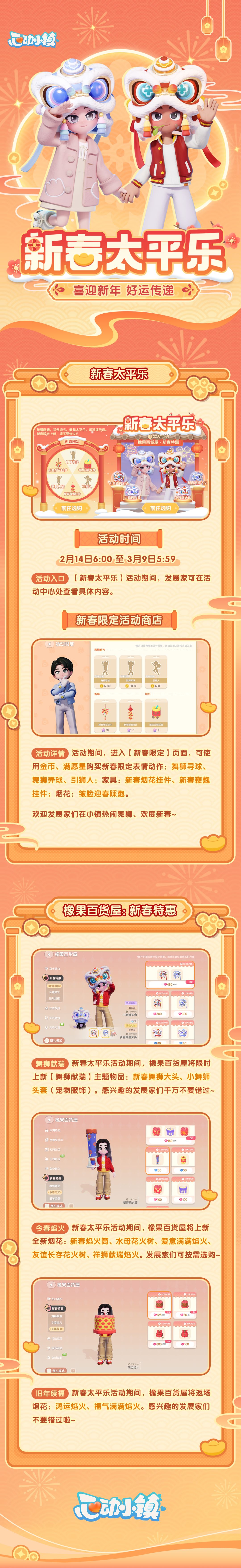 新春太平乐活动即将在2月14日6:00至3月9日5:59开启,来跟随喵喵一起看看有哪些内容吧~