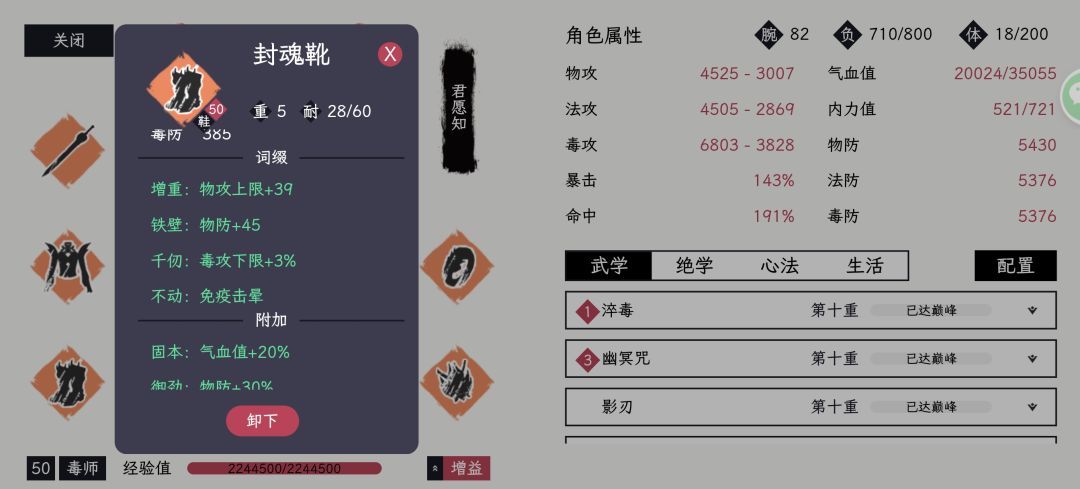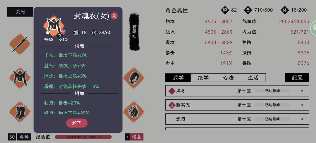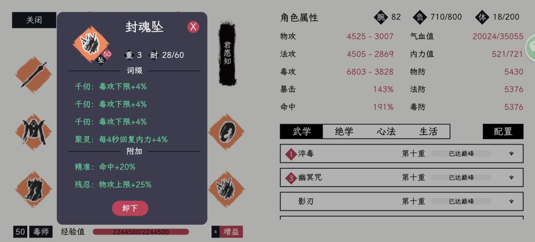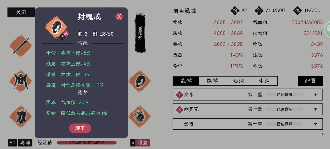 集齐宗门套和无妄后,把装备根据之前的要求洗练一下,必备四条“屠魔”,一条“不动”,优先刷5-10条左右毒攻上下限4-5%(优先下限),其他随意。