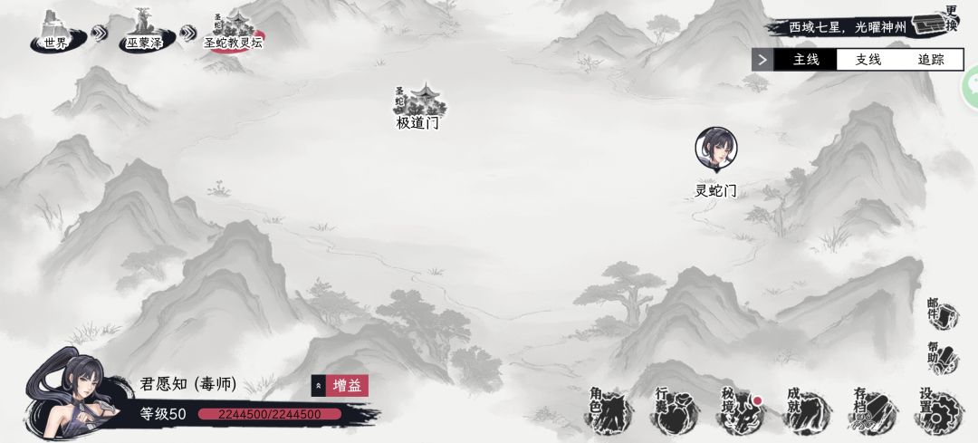 首要任务是凑够钱找包打听开宗门,宗门开在哪里无所谓,开了就行,之后去巫蒙泽-圣蛇教灵坛,把下图两个宗门刷满好感,集齐宗门套,每次提交任务前记得上传存档,如果给了另外一个性别的衣服,就下载存档,读档重来(截止0260211存在bug,可能给另外一个性别的衣服)