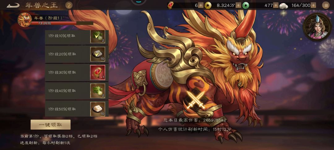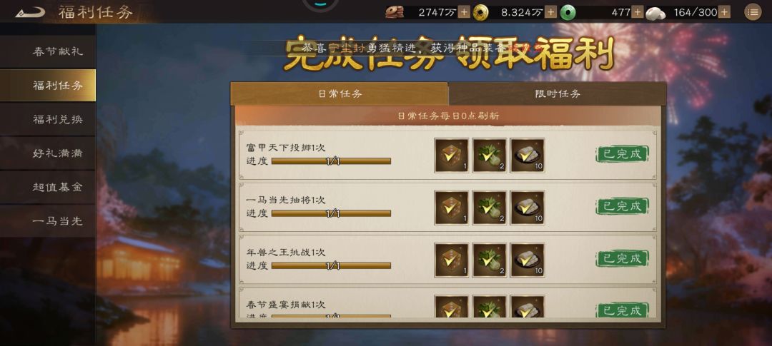 目前兑换道具年糕的免费获取包含每日签到、每日任务已经年兽。