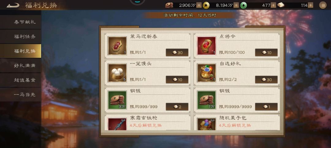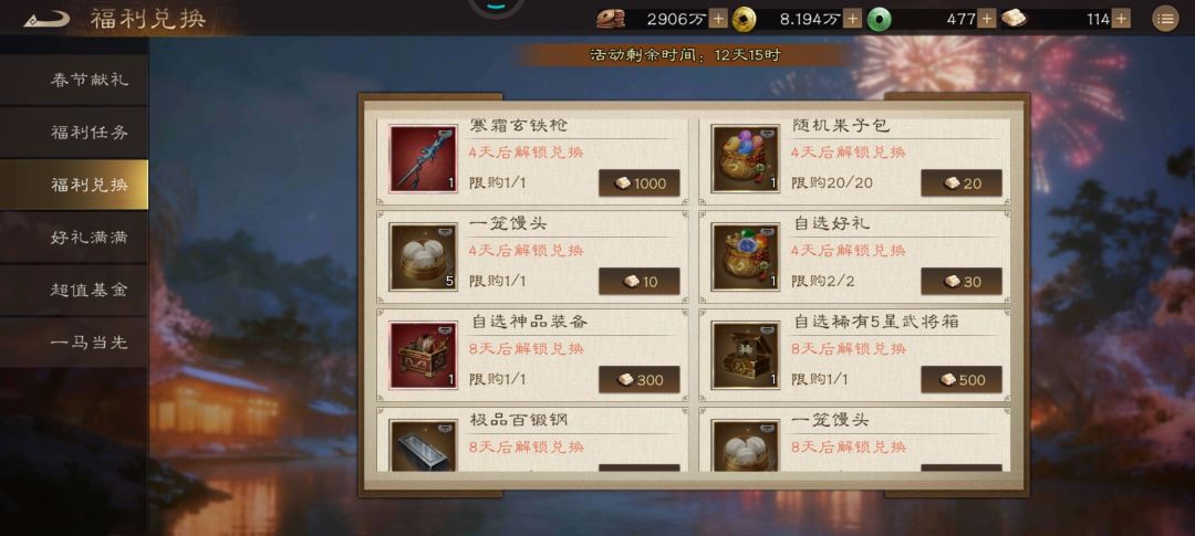 本期福利兑换物品包含[策马迎新春]称号、[点将令]、[一笼馒头]、[自选好礼:10蓝珠、6洗练石、3属性锁、1护灵石之一]、[铜币]、[寒霜玄铁枪]、[随机果子包]、[自选神品装备]、[自选五星稀有]、[极品百锻钢]。