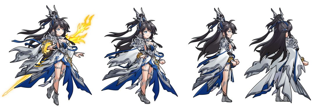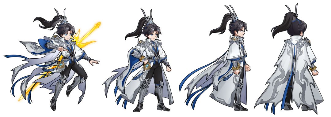 皮肤以蓝白色为主调,以白龙为主要灵感,结合水墨风,呈现出修身的战袍造型。整体如龙跃九霄,携天光云影而来,潇洒而凛然。银白色铠甲如凝雾般贴合身形,腰带勾勒出挺拔轮廓,金镯与金佩于庄重中透着华光;高马尾被银白发冠束起,别有一分飒爽。整体宛如白龙踏云而至,而身后长剑萦绕的金色剑气,正如龙息般在空气中隐隐波动。