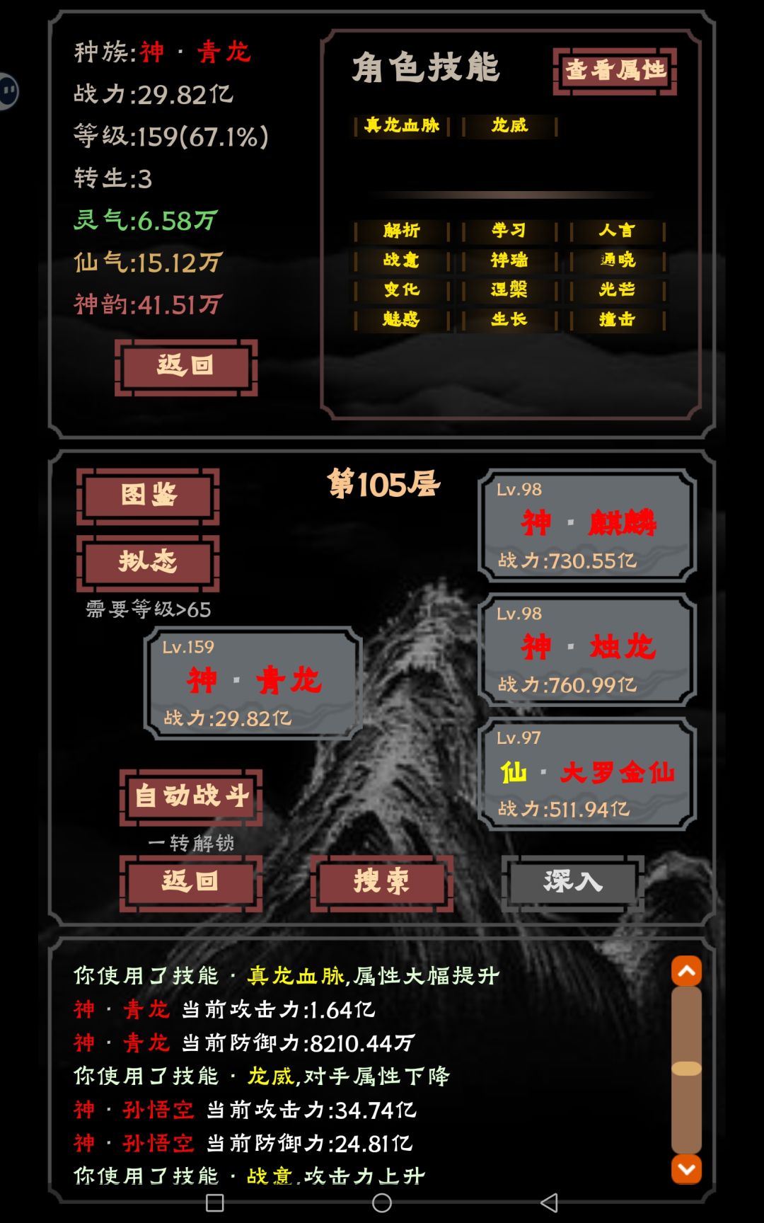 先说个我摸索的刷技能的小技巧:转生结束后,一开始什么技能都不要遗忘,因为越遗忘,消耗等级越多。先随便带技能打到有猴子的层,第一次用遗忘,只消耗5级,拿到“变化”,再打谛听,拿到通晓。这两个层比较深,如果你最后拿,很难很难,因为掉等级太多不好升而且打不过。其他技能同理,从高往低拿。