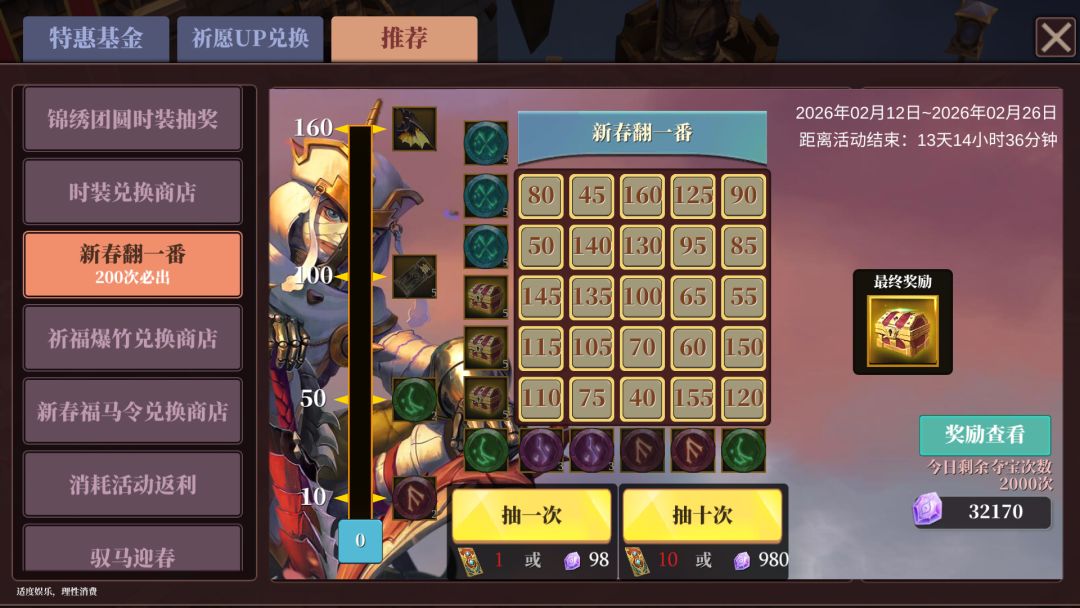 累计抽取次数达到200次,可以获得新春盒子*1,打开即有机会获得无赛季随机装备。