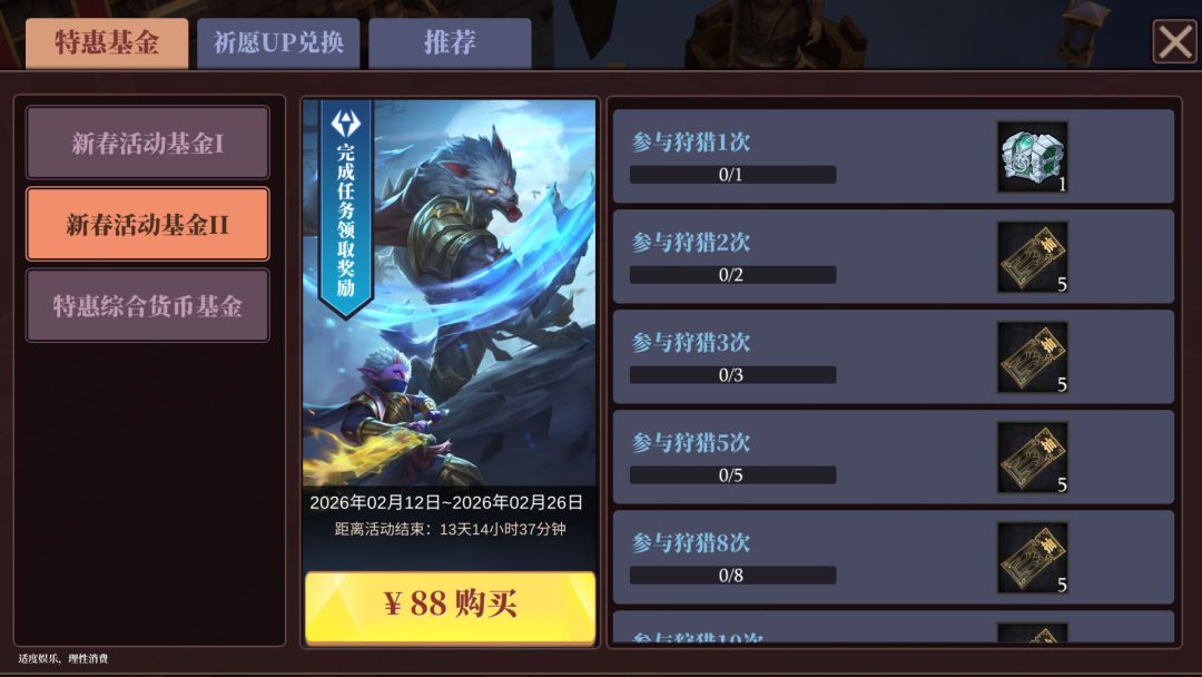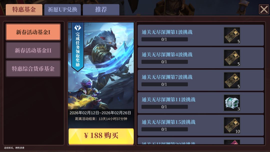 - 购买新春优惠基金并完成任务,可领取路线祈愿券、A阶B阶信物自选、垓伊斯圣物