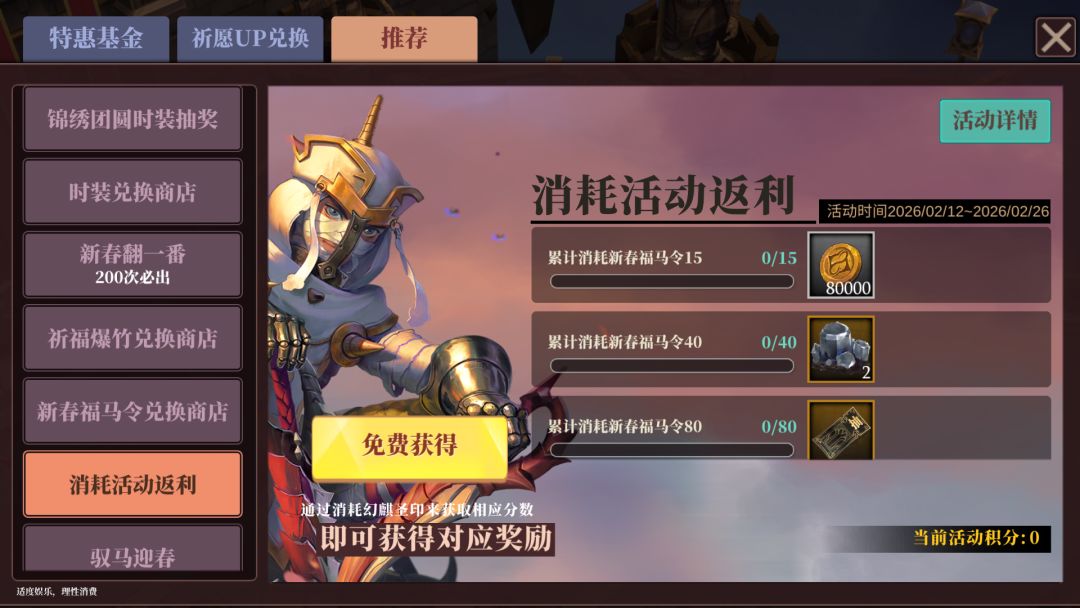 新春福马令消耗返利同步开启,累计消耗即可获得S级宠物「小马驹」、路线祈愿券、魔渊币等。