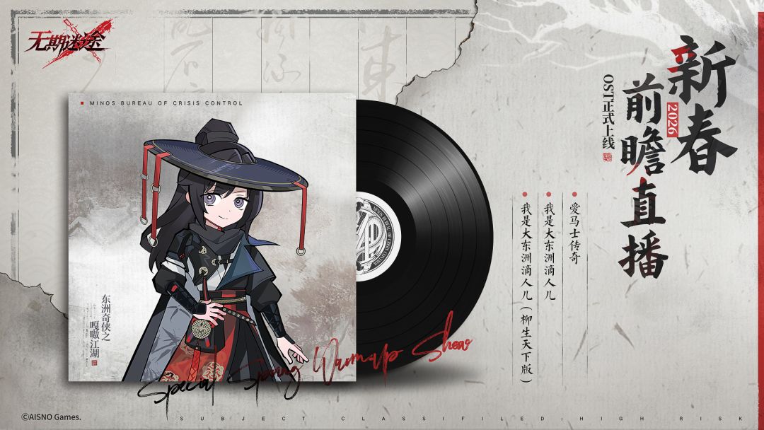 《无期迷途》全新OST《2026新春前瞻直播》现已正式上线,专辑共收录3首以2026新春前瞻庆典直播——《东洲奇侠之嘎嗷江湖》为背景创作的原声音乐。