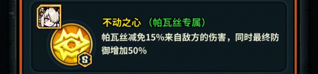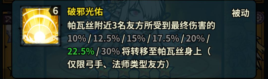 帕瓦丝附近3名友方 所受到最终伤害的10%/12.5%/15%/17.5%/20%/22.5%/30%将转移至帕瓦丝身上(仅限弓手,法师类型友方)