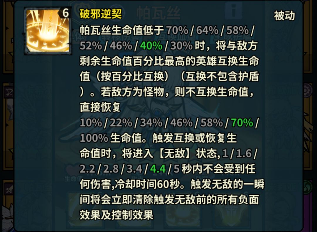帕瓦丝生命值低于70%/64%/58%/52%/46%/40%/30%时,将与敌方剩余生命值百分比最高的英雄互换生命值(按百分比互换)(互换不包含护盾)。若敌方为怪物,则不互换生命值,直接恢复10%/22%/34%/46%/58%/70%/100%生命值。触发互换或恢复生命值时,将进入【无敌】状态,1/1.6/2.2/2.8/3.4/4.4/5秒内不会受到任何伤害,冷却时间60秒。触发无敌的一瞬间将会立即清除触发无敌前的所有负面效果及控制效果