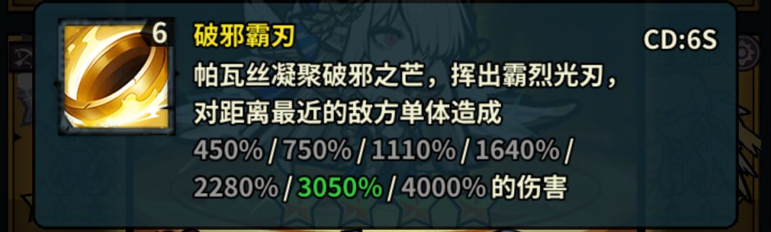 帕瓦丝凝聚破邪之芒,挥出霸烈光刃,对距离最近的敌方单体 造成