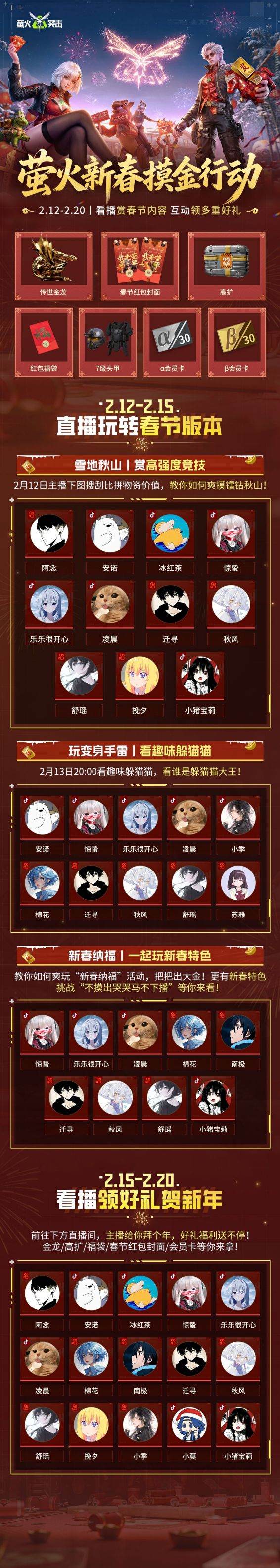 压轴好戏开场!萤火突击新春主播专属摸金行动今日正式开打,这么有趣的直播活动,当然要留着放假看啦!